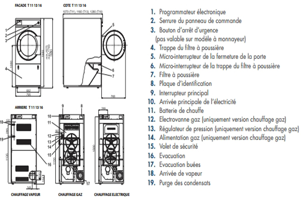 - Compact - toute les machines sont étroites, pratique pour laveries et H.R.C.