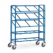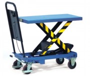 ce chariot à plate-forme élévatrice est muni de 2 roues fixes et 2 roues pivotantes à bandage caoutchouc dur avec freins, moyeu à roulement à billes avec un dossier de poussée fixe boulonné et une pompe hydraulique à pédale.