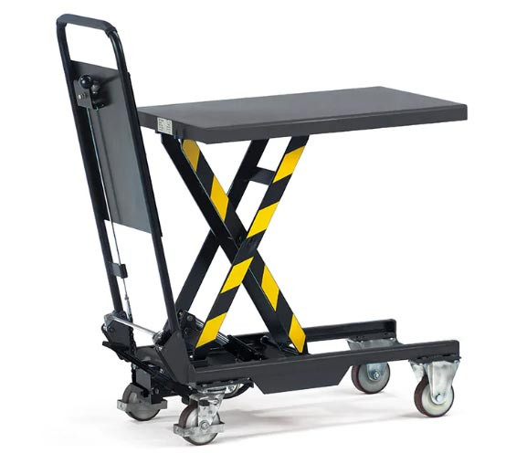 Ce chariot à plateforme élévatrice permet de mettre une charge au niveau de la zone de travail d'un opérateur ou de lever cette charge pour la transférer sur un rack de stockage ou un établi.