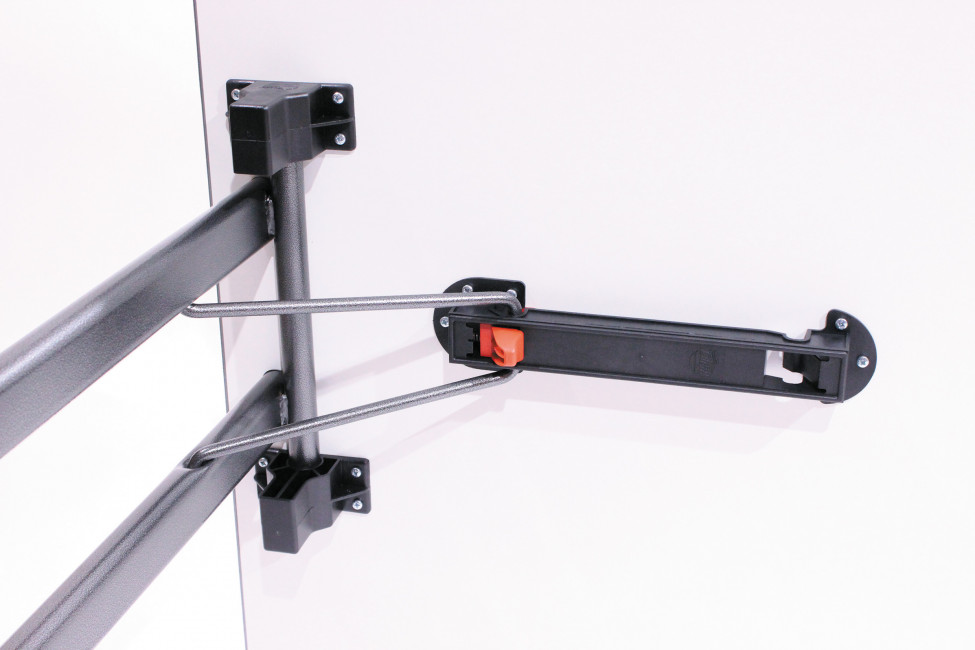 Le système de pliage repose sur un compas en polyamide équipé d'un verrouillage automatique qui sécurise la manipulation.