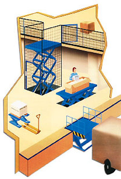 Le plateau s'élève sous l'action de ciseaux poussés par un ou plusieurs vérins hydrauliques.