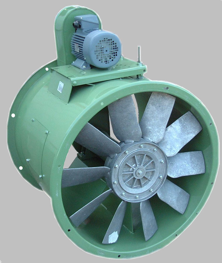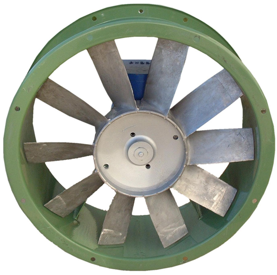 Le ventilateur hélicoïdal, ou axial, se compose d'une virole en tôle à l'intérieur de laquelle tourne une turbine, entraînée par une source d'énergie externe (généralement, un moteur électrique).