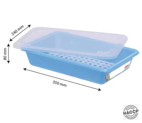 Avec ses dimensions extérieures de 350x240x80 mm, notre bac de stockage professionnel s'intègre parfaitement dans vos réfrigérateurs standards.