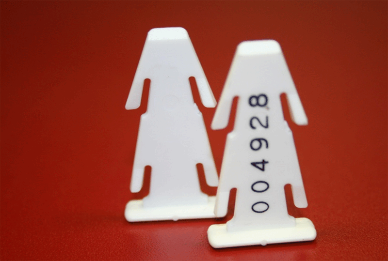 Clavette en polystyrène pour la fermeture de carcans de fûts ou bidons, avec possibilité de les personnaliser par un gravage à chaud (9 caractères et/ou espaces maximum) sous 4 semaines maximum et par multiple de 2500 pièces.
