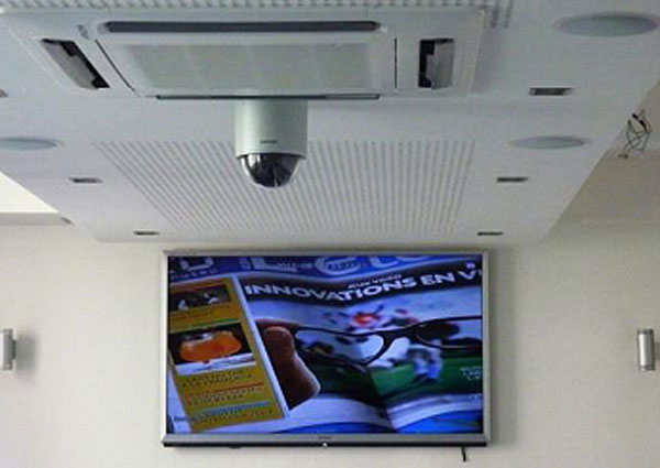 Installer 4 écrans de retransmission d"environ un mètre dans une église, reliés à une caméra et possiblement à un ordinateur qui filme de la tribune, donc avec système filaire pour les relier