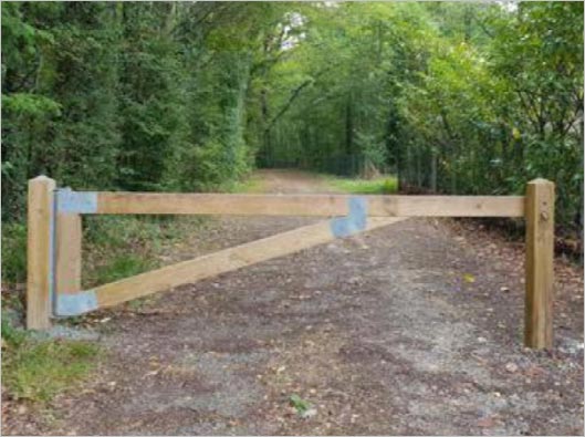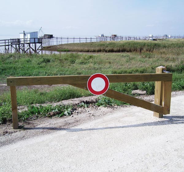 - 4 barrières bois pivotante modèle BAOU lg de passage 4 m avec panneau de signalisation et bande reflechissantes