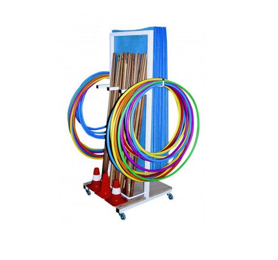 Ce Chariot de rangement polyvalent permet le rangement et le transport de petit matériel sportif à l'intérieur.