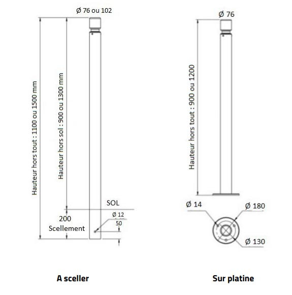 Ce potelet est disponible en deux diamètres distincts, Ø 76 mm et Ø 102 mm, permettant une intégration harmonieuse dans différents contextes urbains.