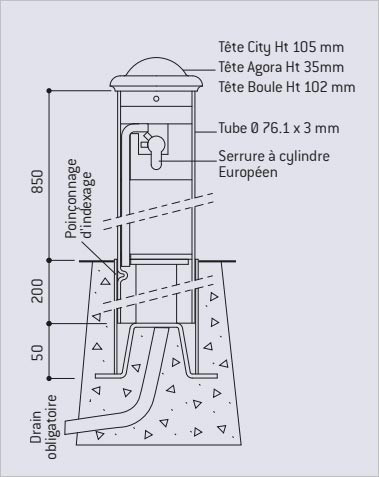 Hauteur hors sol : 850 mm Diamètre : Ø 76 mm Matière : Acier Fixation par scellement direct 10 couleurs disponibles