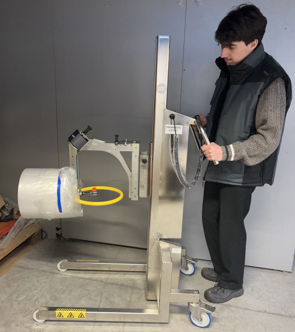 1- Chariot élévateur manuel pour fûts (Capacité 350 kg, Tout acier inoxydable ) - Code fiche produit :14698998