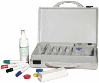 Cet accessoire pour tableau est composé d’une mallette contenant 4 marqueurs, une brosse d’effaçage magnétique, 10 recharges en feutre pour brosse, une bombe de nettoyage et 6 aimants.