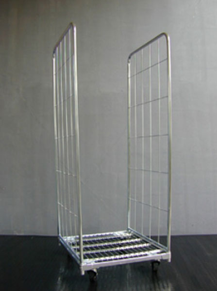Un chariot de transport 3 parois et composé d’une base sur roulettes et de 3 côtés.