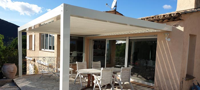 pergola bioclimatique orientable motorisée sur mesure permet d’aménager un espace extérieur en apportant une protection contre le soleil et les intempéries.