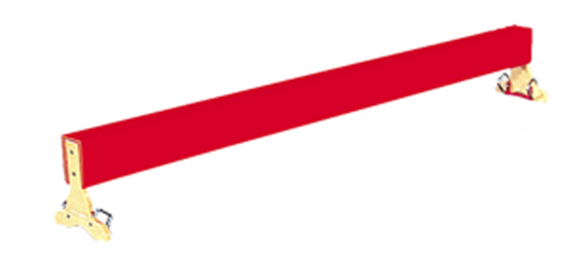 Conçue en bois et revêtue de moquette, elle est munie de crochets basculants pour être fixée aux socles ou à une autre poutre identique.