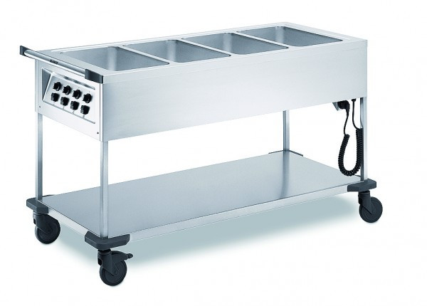 Idéal en cuisine centrale, en établissement de santé ou en self-service, ce bain marie sur chariot facilite le service des repas en toute autonomie.