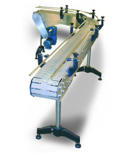 Optimisez le transfert de palettes, de colis ou tout autre produit emballé tout en maintenant une ligne de production continue, par la mise en place d'un convoyeur courbe à chaînes !
