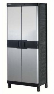 Armoire à haute résistance d’une grande capacité de stockage avec des côtés et porte intérieures pré-perforés pour accrochage facile des outils, un montage vite et facile, des renforts métalliques et des pieds réglables pour plus de stabilité.