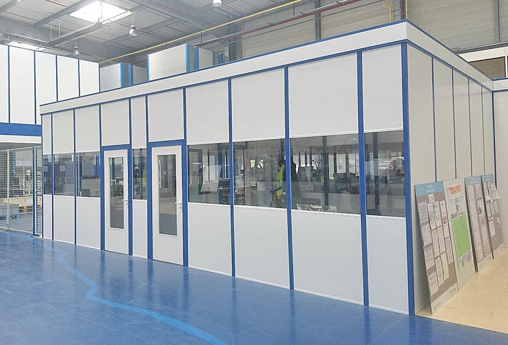 *Cloisons pleines en panneaux métalliques bleus avec portes intégrées.