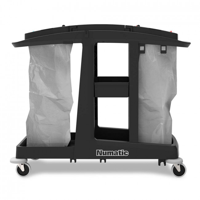 Ce chariot possède deux collecteurs de déchets de 120L avec couvercle et une zone de stockage avec des étagères de rangement.