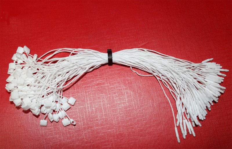 Je cherche des attaches en plastic à fermeture manuelle pour attacher des étiquettes de prix à trou sur des articles de maroquinerie, ceintures,... en blanc et en 120mm