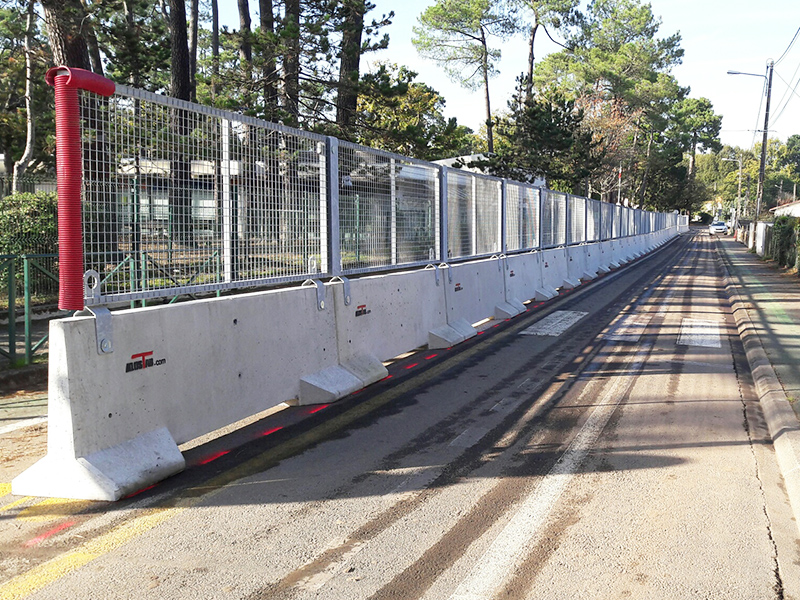 Ce mur devant être posé sur du bitume, et ne souhaitant pas faire de fondations, nous avons pensé à unUne cloison en barrière béton réhaussée d"un grillage.