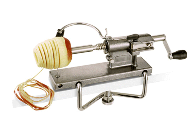 Cette éplucheuse manuelle 2 en 1 permet d'éplucher, trancher et évider les pommes en une seule opération.