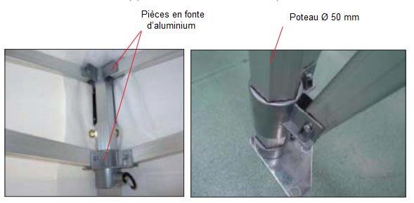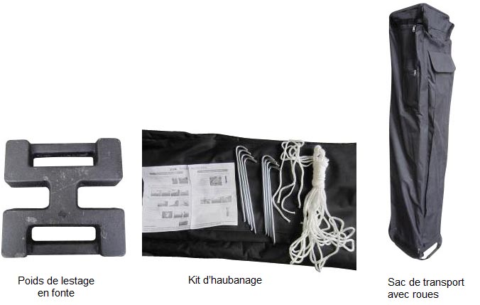 Structure aluminium Toile PVC 520 g/m², classé M2 Dimensions : 3x3 m, 3x4,5 m, 4x4 m ou 3x6 m Livrée avec kit d’haubanage et sac de transport