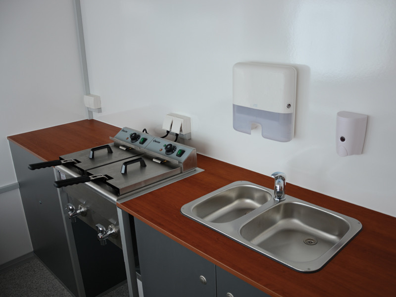 - 1 évier double intégré dans un meuble avec réservoir d’eau usée, distributeur de savon et serviette