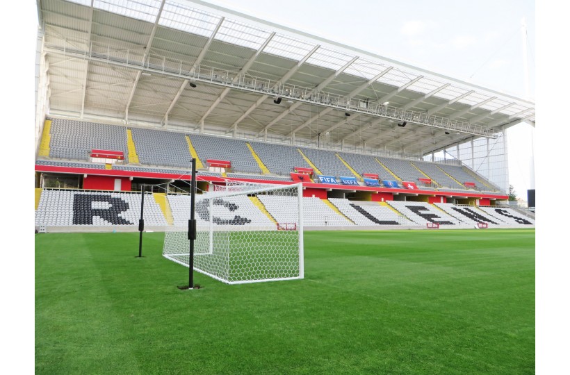 Transversale MONOBLOC assemblée aux montants verticaux par équerres métalliques soudées positionnées à l’intérieur du profil permettant une parfaite conformité au règlement FIFA et UEFA .