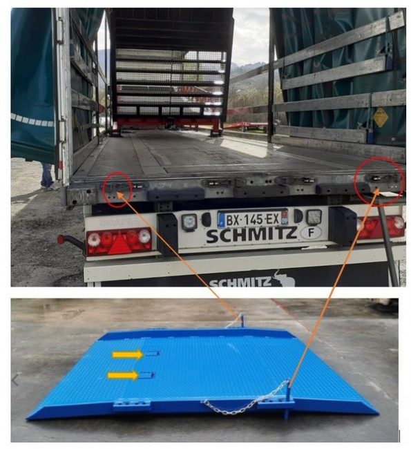 Cette rampe se déplace facilement grâce aux deux fourreaux de fourche disposés sur sa face supérieure à l'aide d'un chariot élévateur. Ces fourreaux sont escamotables rapidement dans le plancher et obstruent l'orifice pour un passage sans à-coups des matériels de magasinage.