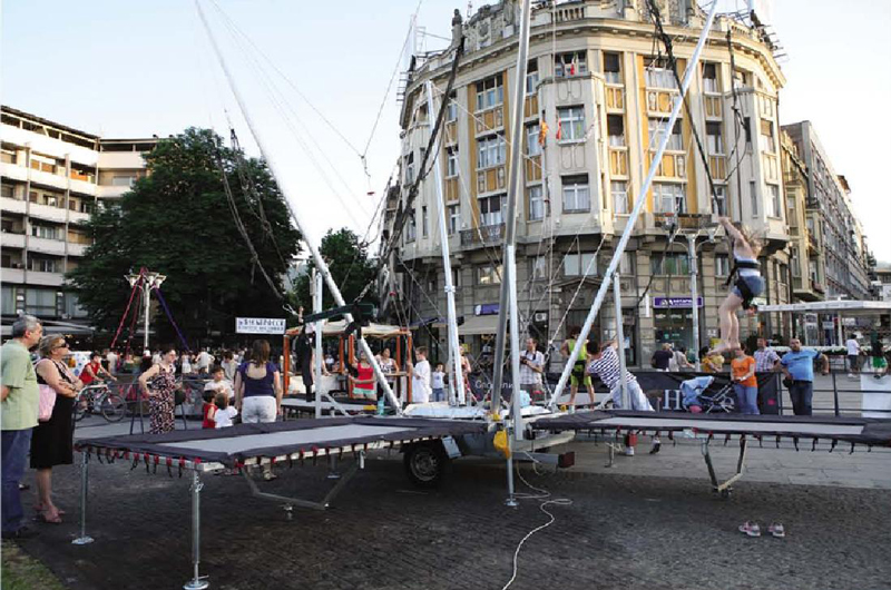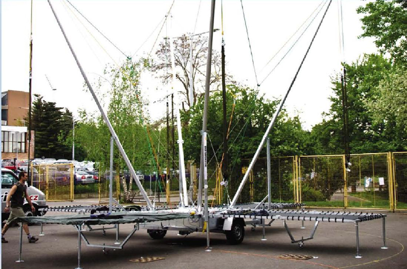 La particularité de ce modèle tient au fait que ses 4 trampolines rectangulaires repliables, sont fixés à demeure sur la base de la remorque, facilitant ainsi la manutention du bungee.