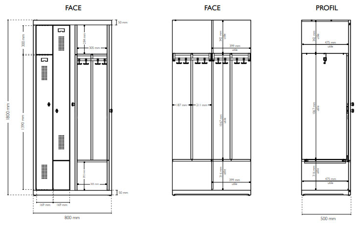 - Dim. hors tout : L400/800/1200 x P500 x H1800 mm
