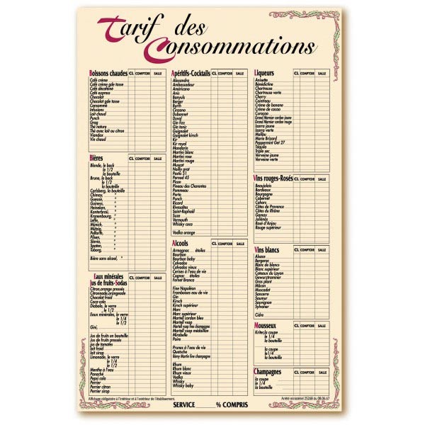 Demande de prix pour Panneau tarifs des consommations pour bar - 38 x 58 cm