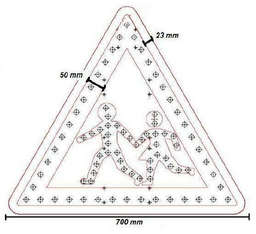 Diodes rouge : 30 diodes rouge sur contour des cercles et 42 sur contour triangle.