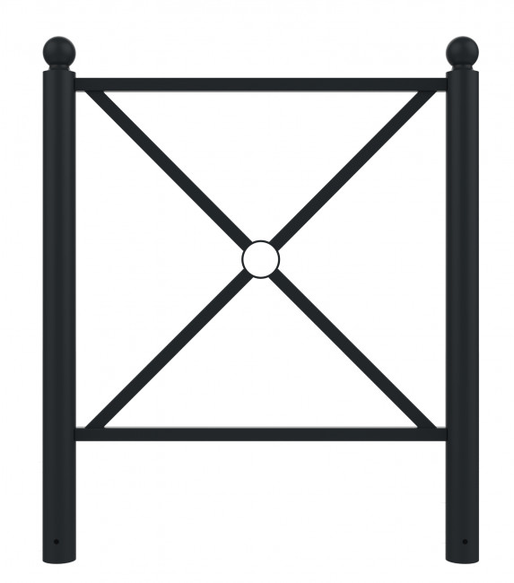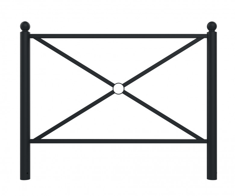 L’habillage en croix de Saint‑André et la tête boule confèrent à cette barrière de trottoir acier une esthétique immédiatement reconnaissable.