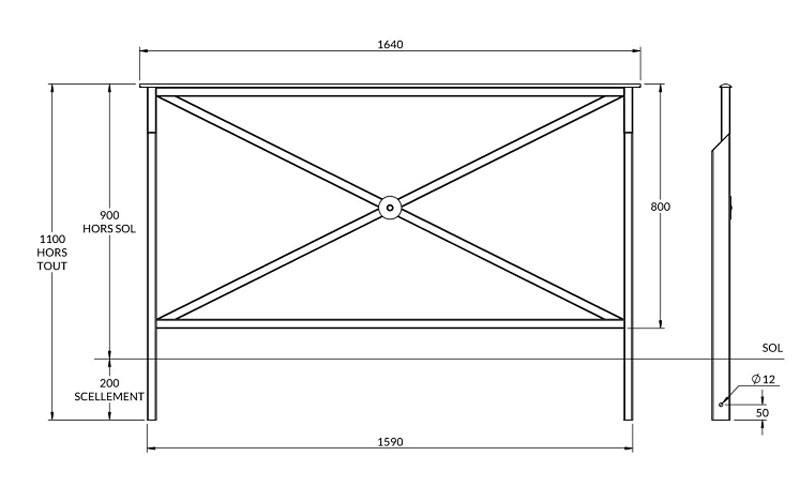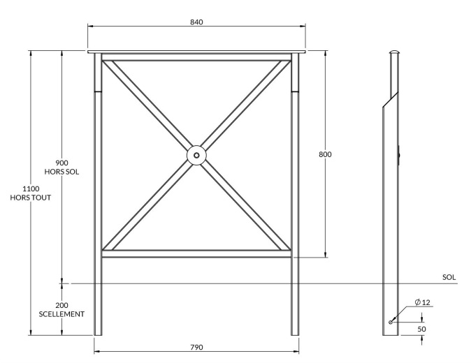 - Montants latéraux, lisses et croix : tube de 30 x 30 mm
