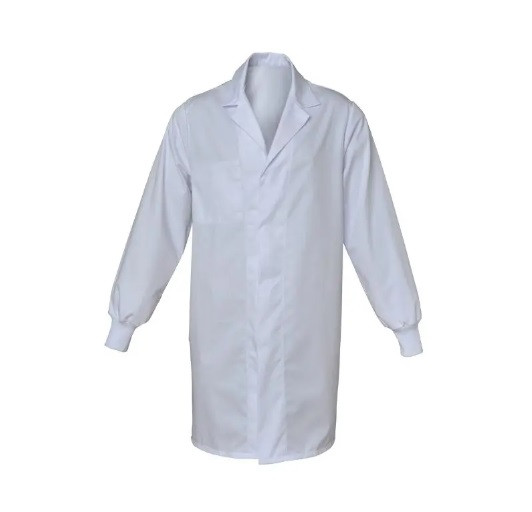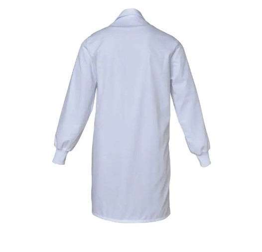 Cette blouse de protection blanche est un équipement de travail destiné aux professionnels du secteur agroalimentaire.