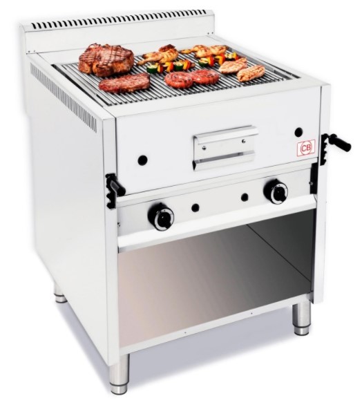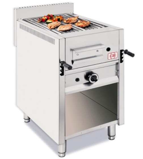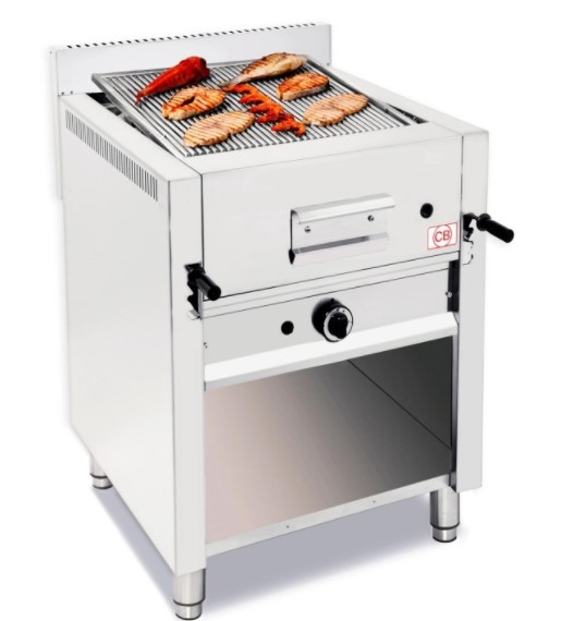Cette grill à pierre de lave professionnel de comptoir avec meuble ouvert, avec grille professionnelle incluse avec possibilité de la remplacer par d'autres.