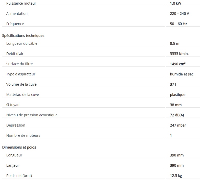 Conçu pour répondre aux exigences des usages professionnels, cet aspirateur est idéal pour une large gamme d'applications et est adapté à différents types d'utilisateurs, qu'il s'agisse de petites entreprises, d'ateliers, ou même de grandes installations industrielles.