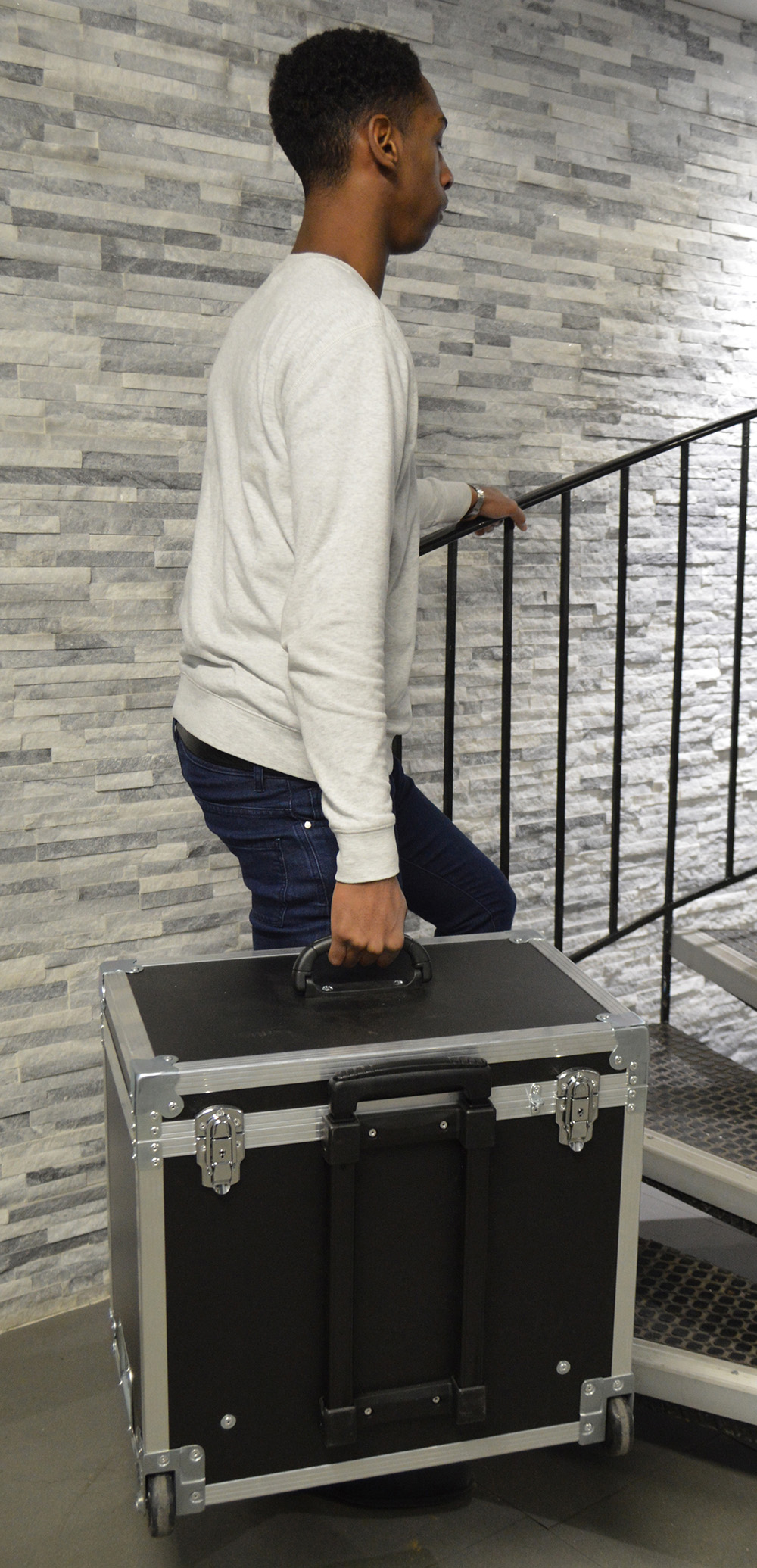 Pour une utilisation mobile, la valise tablette sur roulettes est équipée d'une poignée télescopique et de serrures à clés.