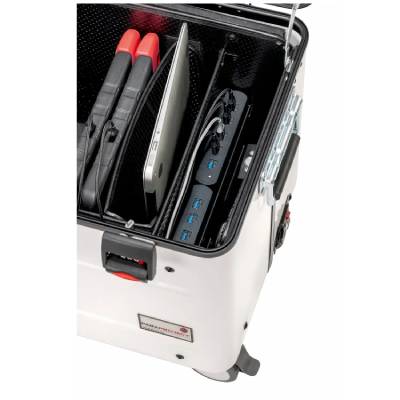 Grâce aux HUBS USB intelligents à double connectique USB-A et USB-C, notre solution permet la recharge simultanée des tablettes iPad, sans réglage manuel. La gestion automatique de la puissance adapte la charge à chaque appareil. La sécurité est intégrée au fonctionnement : recharge possible valise fermée grâce à l’alimentation centralisée, capteur de température avec arrêt automatique en cas de surchauffe et ventilation optimisée par des ouvertures dans le couvercle et le fond de la valise.