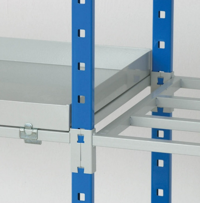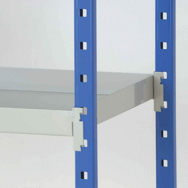 Rayonnage en bac tôlé avec connecteurs d’accroche soudés aux extrémités :