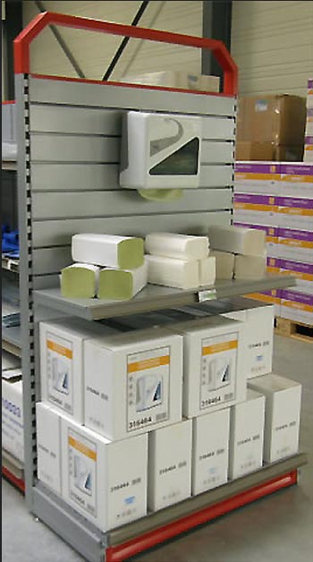 04/04/2014profondeur 500mm; hauteur 3000mm; largeur 1300mm: fond perforé. coloris blanc. 4 étagères. 3 éléments de départ; 6 éléments suivants. 40 étagères avec position inclinable avec porte étiquette en façade.
