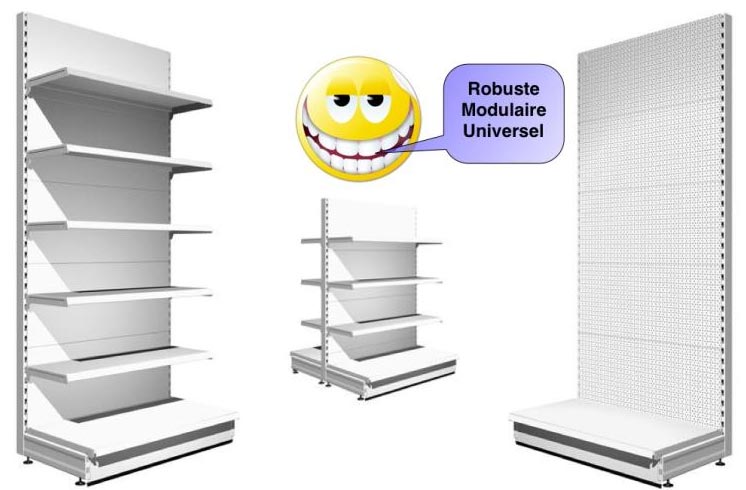 8M linéaires de gondoles avec fonds perforés de hauteur 2250mm, 1040mm de longueur pour la base et 1000mm pour les suivants et de profondeur 58MM.RAL 7016.