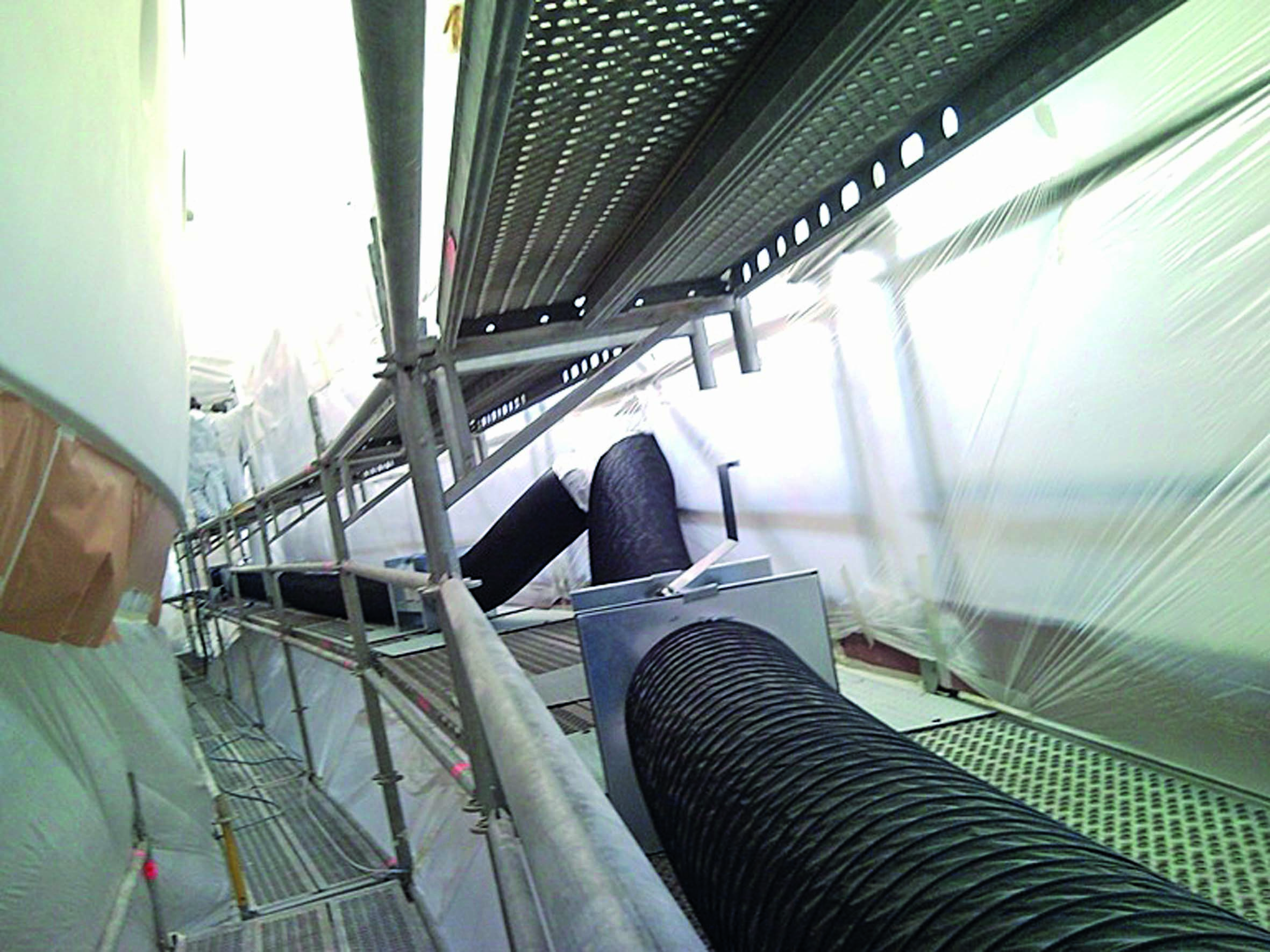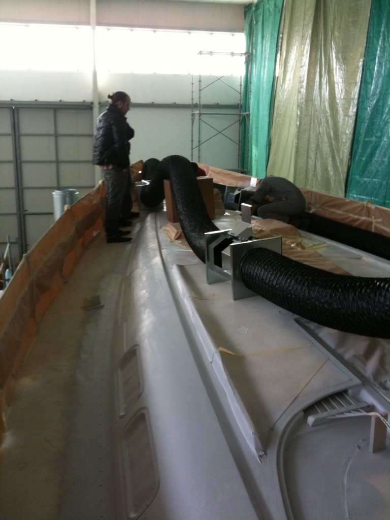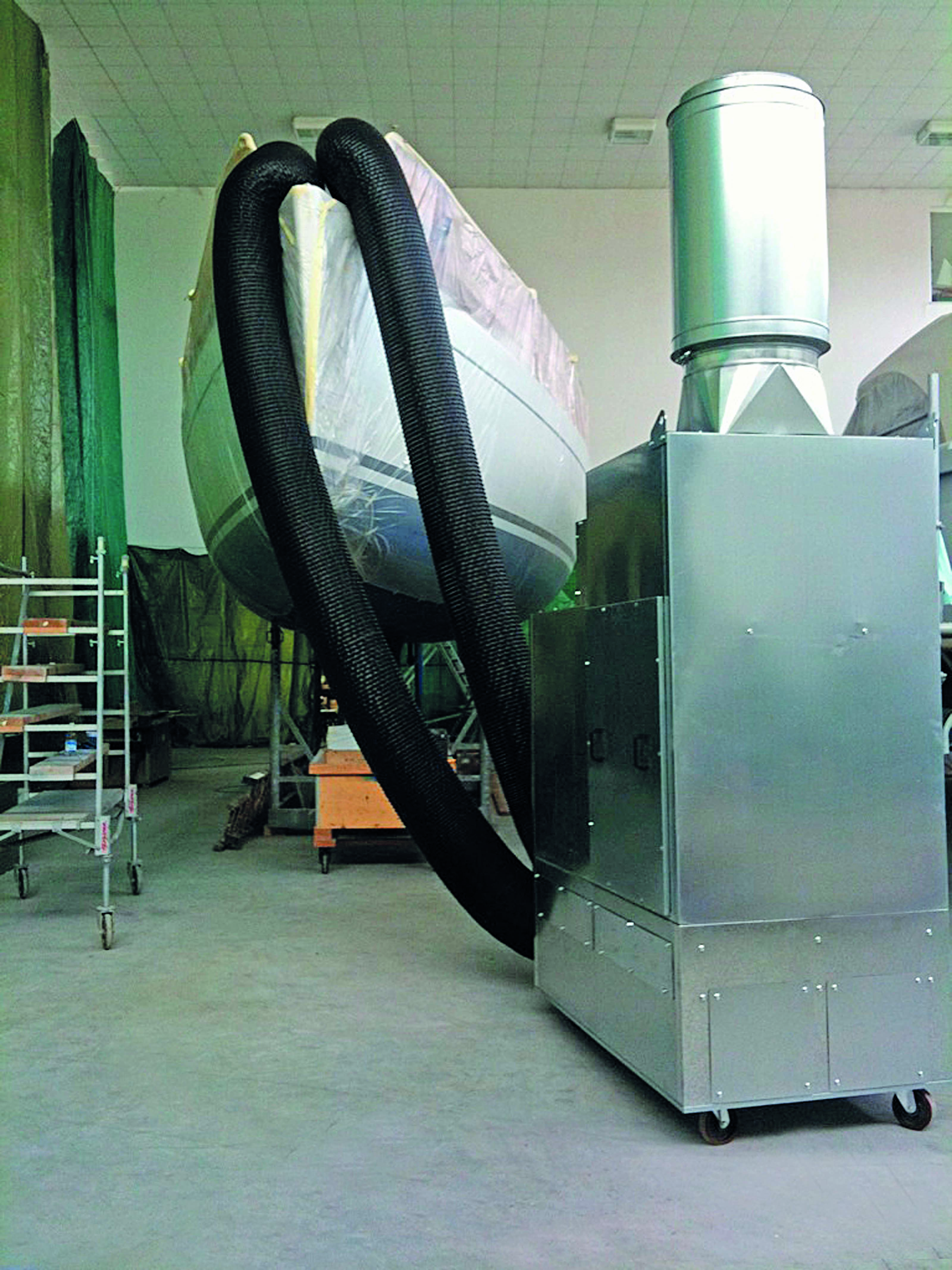 - Le système composé tel que décrit permet d'opérer dans un environnement sain pendant tous les processus où il est impossible de faire fonctionner avec des systèmes traditionnels tels que les cabines de peinture et des murs d'extraction en raison de l'encombrement de la matière et du bateau à peindre ou à poncer.
