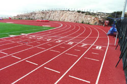 1) un vrai revêtement de piste d"athlétisme avec marquage de plusieurs couloirs