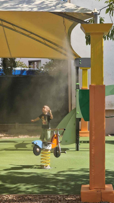 Les brumisateurs intégrés et le concept d’ilots de fraîcheur végétal favorisent une atmosphère agréable et respectueuse de l'environnement, tout en embellissant le cadre scolaire.
