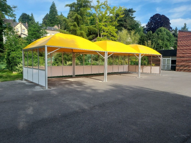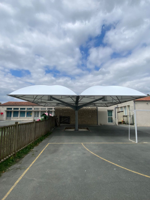 Préaux d'écoles sur 1, 2 ou 4 poteaux en alu ou acier. Ces poteaux peuvent être centraux ou bien déportés. La couverture en toile tendue permet de maintenir la luminosité dans le cas de préaux adossés à des bâtiments scolaires. En effet la toile PVC a cette particularité d'être translucide et donc de ne pas couper la luminosité. Ces préaux sont juxtaposables à l'infini. Vous pouvez choisir différentes couleurs de toile et de plus la toile est imprimable ce qui vous permet d'intégrer un logo ou une communication sur le lieu. Nous pouvons également vous proposer de fermer certains cotés de façon à protéger des vents dominants. Nos dimensions sont standards, 3x3, 4x4, ....10x10m. Ces préaux peuvent également convenir pour l'équipement de crèches ou de couvertures pour des véhicules sur des parkings de copropriétés ou de halls d'expositions pour garages automobiles. En alignement, ils peuvent permettre de créer une allée couverte pour relier deux bâtiments. Dans certains cas ils peuvent parfaitement s'adapter pour des drives et permettre de protéger les clients des intempéries
