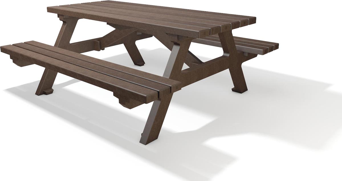 Cette table pique nique est fabriquée en plastique recyclé de couleur marron.