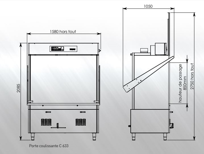 - Dimensions hors tout (l x p x h) fermé : 1580 x 1050 x 2085 mm / 1560 x 920 x 2085 mm
